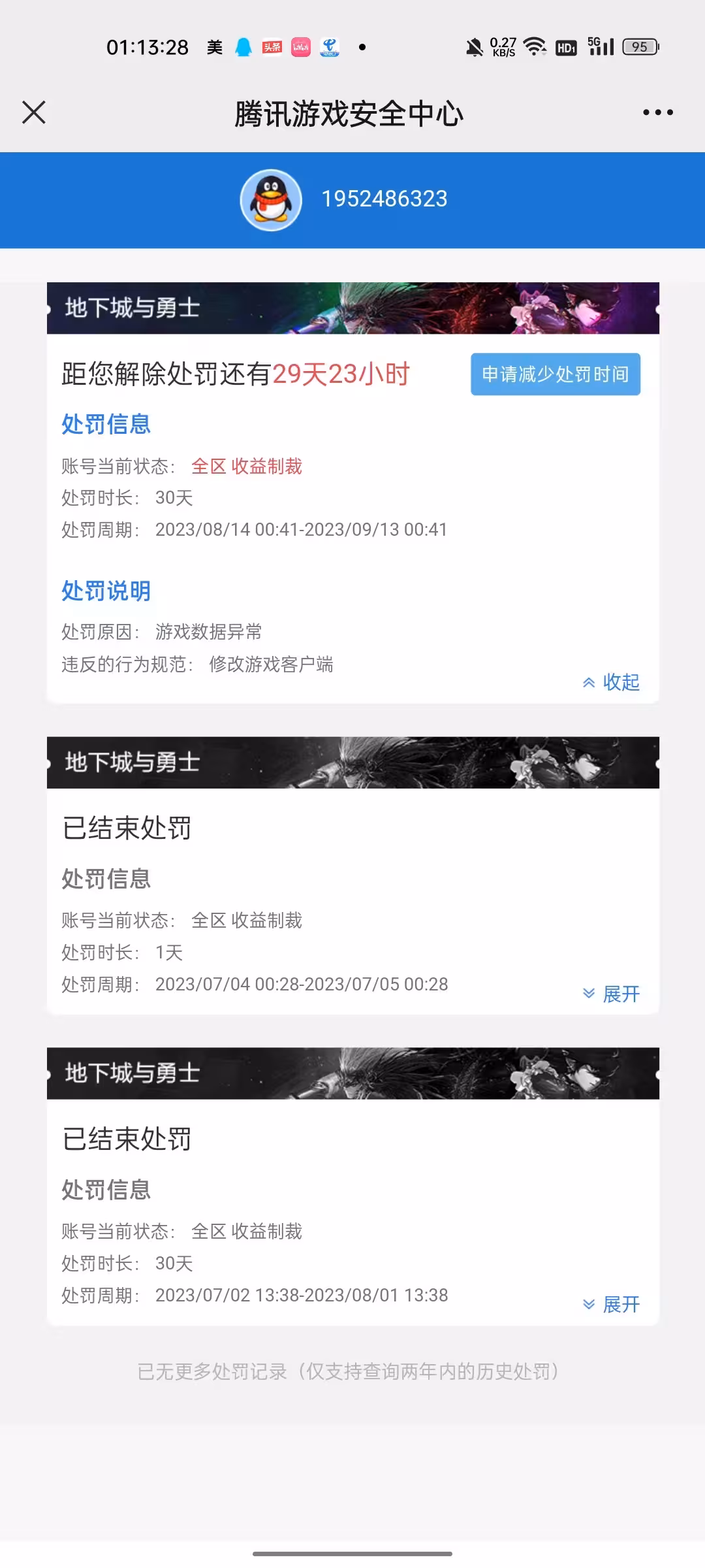 制裁/封号描述:游戏数据异常,违反行为规范,修改游戏客户端